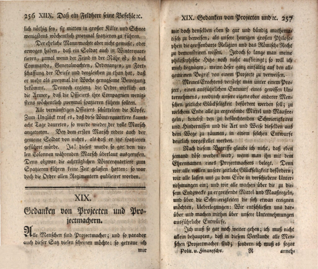 in: ders.: Gesammlete Politische und Finanzschriften über wichtige Gegenstände der Staatskunst, der Kriegswissenschaften und des Cameral= und Finanzwesens. Bd. 1, Kopenhagen/Leipzig 1761, S. 256–281, hier S. 256/57.
