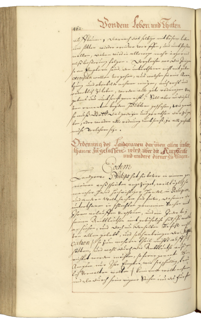 Wigand Lauze: Von dem Leben und Thaten des Durchleuchtigsten Fursten und Herren, Philippi Magnanimi, Landgraffen zu Hessen […] (Erster Theil), Bl. 462: Ordennung des Landgraven darinnen allen Unterthanen zugelassen wird, über die Amptleute und andere diener zu klagen.